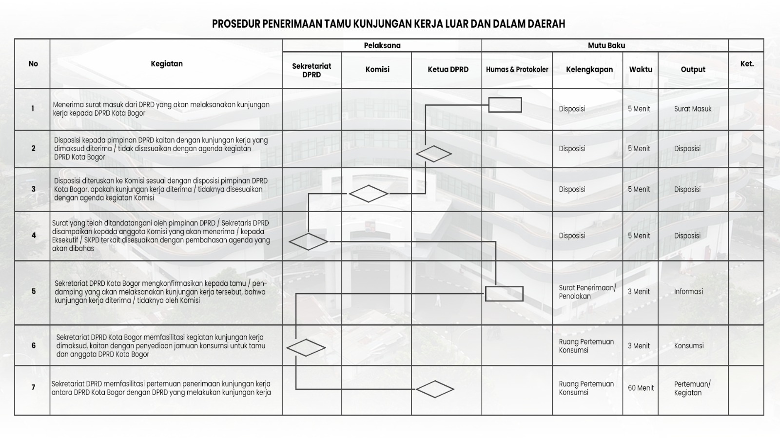 Setiap penerimaan Tamu Kunjungan Kerja Luar Daerah ke DPRD Kota Bogor memiliki tahapan yang tertata. Dimulai dari surat permohonan kunjungan yang masuk ke Sekretariat DPRD. Surat tersebut kemudian diteruskan kepada pimpinan DPRD untuk diberikan disposisi, menyesuaikan dengan agenda kegiatan yang sudah ada.
